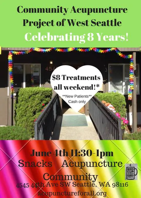Sunday, June 4th 11:30am – 1pmJoin Community Acupuncture Project Sunday, June 4th 11:30am-1pm for coffee, sweet treats, free acupuncture and an opportunity to meet all the acupuncturists, your neighbors and tour the clinic. Free and open to all!All weekend long, June 2, 3, & 4, they will be running an anniversary special for new patients!Tell your friends and family who have been curious about acupuncture to check this special out! New patient Special: $8 first time treatments, cash only.Schedule here: http://www.acupunctureforall.org/west-seattle/206-933-78914545 44th Ave SW @ Alaska