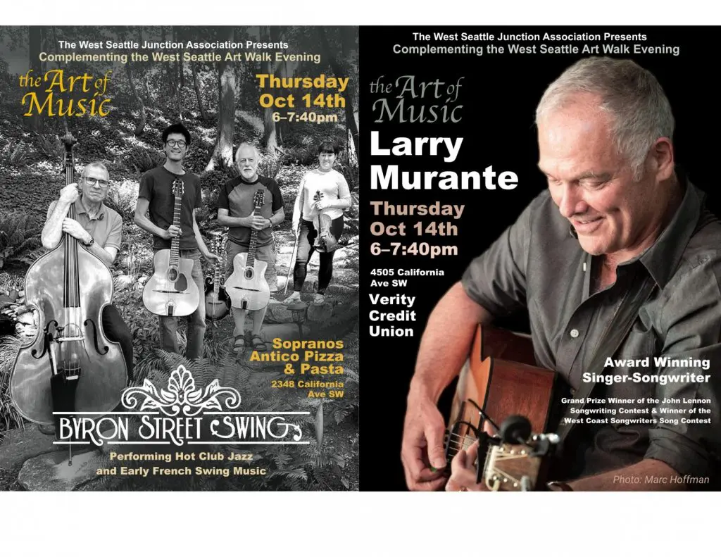 See our Art of Music Facebook Event on our West Seattle Art Walk page, then click the dates you’re interested in to get updates. Participating Art Walk businesses will also have event flyers to share.