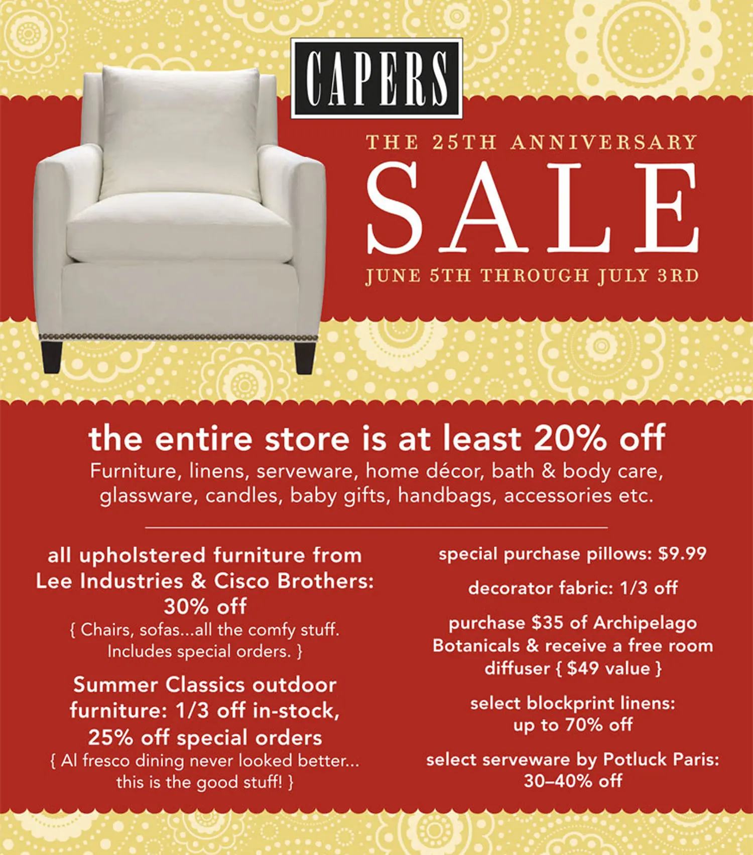 It’s Capers silver anniversary!  Congratulations!“June 24th Anniversary Party. Raise a glass with us to celebrate our time in the neighborhood and what the future holds.”]]>