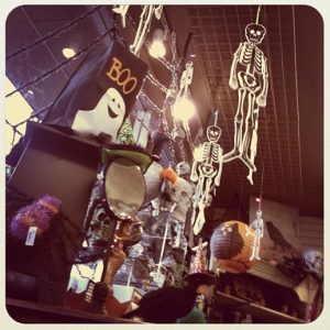 Illustration of a witch in a black dress and hat, riding a broomstick with an orange and green background featuring star accents.