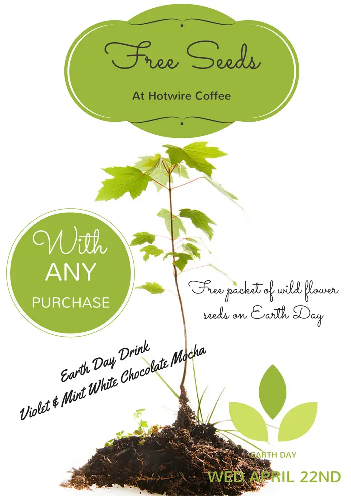 Earth Day is tomorrow, Wednesday, April 22nd, and Hotwire Coffee is celebrating in style. Come in for your free packet of wildflower seeds (with any purchase).  Their featured beverage for Earth Day is the violet, mint and white chocolate mocha, which sounds just perfect for spring!
