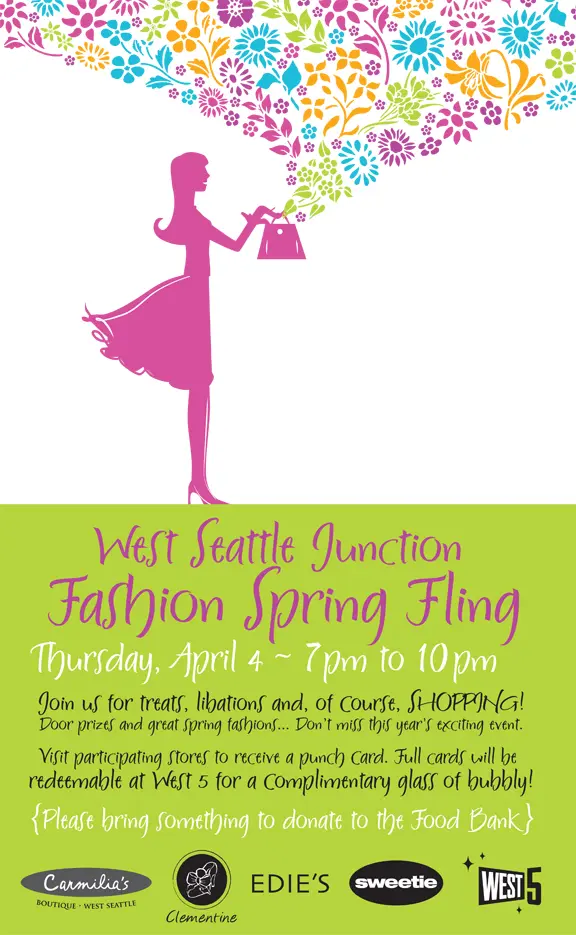 It’s time to clean out and make space in your closets because the annual West Seattle Junction Fashion Spring Fling is back. Fill up your closets and shoe racks (If you want to do it Imelda Marcos style) with items from Carmilia’s, Clementine, Edie’s, and Sweetie. Visit participating stores to get a punch card. A full card will get you a complimentary glass of bubbly from West 5! There will be door prizes too! Remember to bring donations for the food bank! Enjoy the the beginnings of spring with shopping and bubblies on April 4th, 7pm – 10pm.