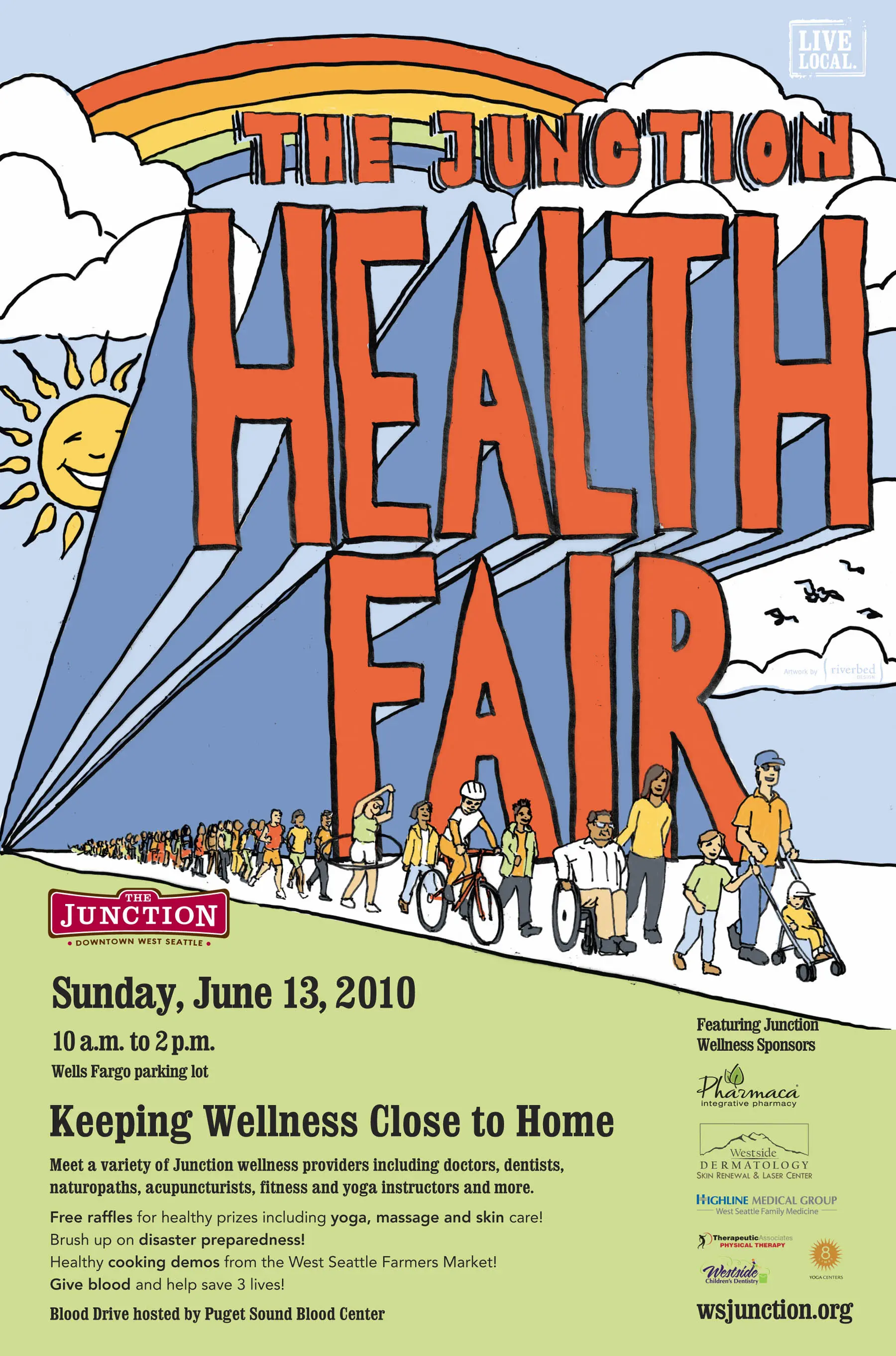 West Seattleites have the opportunity to meet their local wellness partners, brush up on disaster preparedness, help save 3 lives by giving blood, and enter to win healthy prizesWhen: Sunday, June 13 201010 a.m. – 2 p.m.What: 20 health and wellness providers located in the West Seattle Junction neighborhood are participating in the first annual Junction Health Fair as a way to educate West Seattleites on the wide range of health services in multiple disciplines available to them without having to cross the bridge. In addition to the array of physicians, dentists, massage therapists, fitness and yoga studios, pharmacies and vitamin stores, there will be healthful and interesting activities for the whole family to enjoy.Give blood at the blood drive – Junction fire fighters and police officers – Disaster preparedness experts – West Seattle Farmers Market demonstrating healthy cooking with fresh, local produce.Most participating wellness providers will have fun freebies at their booths, and all will have a free raffle item, including yoga classes, massage therapy and baskets of vitamin supplements.Why: The West Seattle is home to a broad range of health providers, from dermatologists, to dentists, urgent care walk-in clinics and compounding pharmacies, massage therapists to alternative medicine clinics. While West Seattleites use The Junction for dining out, arts and culture and boutique shopping, the West Seattle Junction Association wants to bring attention to the wellness services available to them without having to leave the West Seattle peninsula.Where: The parking lot of the West Seattle Well Fargo Bank located at 4314 SW Alaska Street in The Junction.Who: Meet the following Junction Health and Wellness Providers