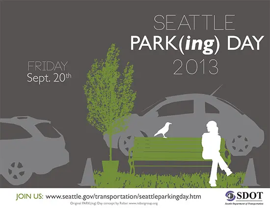 Come experience PARK(ing) Day on September 20, 2013 from 9:00 a.m. to 3:00 p.m.! PARK(ing) Day happens once a year, on the third Friday in September, and is an opportunity for any Seattleite to temporarily make parking spaces into parks. The event raises awareness about important issues like creating a walkable, livable, healthy city. The original PARK(ing) Day concept was developed by Rebar in San Francisco and has grown into a global movement with close to 1,000 parks in more 35 countries in 2012.This year, SDOT approved applications for 45 parks around the city, each offering a fun and unique way to engage with the local community. Check out the map below or this link for mobile devices to find PARK(ing) Day installations in your neighborhood.]]>