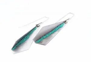 West Seattle artist Sarah Loertscher is coming to Click! Design That Fits with new installation work and a new jewelry line. Sarah’s new collection of geometric, crystalline jewelry is called the F-series. Fe is the symbol for Iron, the element at the heart of her steel collection. Sarah’s clean, angular forms are cut and folded from mild steel to create light, faceted structures.
