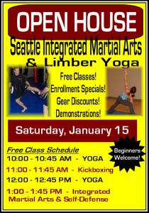 Seattle Integrated Martial Arts (SIMA) & Limber Yoga is having an Open House Saturday, January 15th! They will have free Yoga, Kickboxing and Integrated Martial Arts Classes, beginning at 10 am. Beginners welcome! There will also be free demonstrations, enrollment specials and gear discounts. Come meet Bob and Aubrey, the folks who run the place and check it out for yourself! SIMA Mission Statement: Our goal is to provide an environment that promotes fitness, health, open mindedness, community, personal responsibility and personal growth. Photo: SIMA]]>