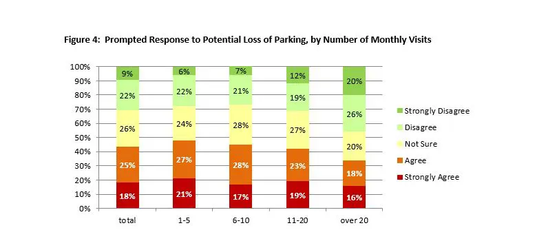 Those that mentioned “free parking” in this question were slightly more likely to have lived in the area over 20 years than the average participant (31%).  However, they did not differ from the average in how often they visited the junction. Prompted Response to Potential Loss of Parking When asked directly later in the survey how much they agreed with the statement “I would not come to the Junction without free parking”:
