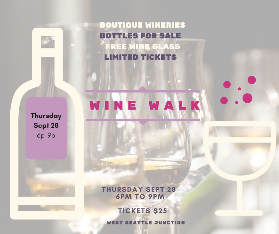 Added Sept 29th – we hope you enjoyed the first West Seattle Wine Walk. Make sure you check out pictures of the Wine Walk on the Junction Facebook page. Thank you to Tami and Molly (Junction volunteers) for taking photos of the evening!Tami L and Molly M-P:[gallery ids="20590,20591,20592"][gallery ids="20595,20594,20593"]Limited tickets $25 advance or $30 day of the event . Wine Walk is SOLD OUT! If you would like to get on the wait list in case of cancellations, email the Junction, we will notify you of any open tickets. Stay tuned for dates in 2018.The West Seattle Wine Walk celebrates wine with this vibrant and fun event. Located in the heart of West Seattle, the Wine Walk provides you with the opportunity to meet the boutique wineries around the Pacific Northwest.Housed in some of West Seattle’s favorite merchants, you’ll enjoy tastings from 15 different wineries, each showcasing a unique variety of wines.Bottles of wine and additional individual wine tasting tickets will available to ticket holders. You can drop off bottles of wine at the valet located at Capers. Additional Wine Walk tasting tickets will be available at Capers for $1.00 per ticket. Only ticket-holding attendees can purchase additional tasting tickets.Complete with a West Seattle Junction Wine Walk glass.The night of the event, please go to our check-in host at Capers located at 4525 California Ave SW in the heart of the Junction.We will have your name on a list at our check-in list. You’ll be I.D’ed (must be 21 years or older). You’ll be presented with your tasting tickets and complimentary wine glass.Brown Paper Tickets Ticket Widget Loading…